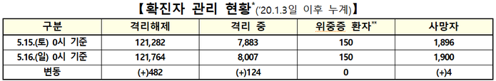 ▲ 16일 0시 기준 코로나19 확진자 관리 현황. [출처=중앙방역대책본부] |