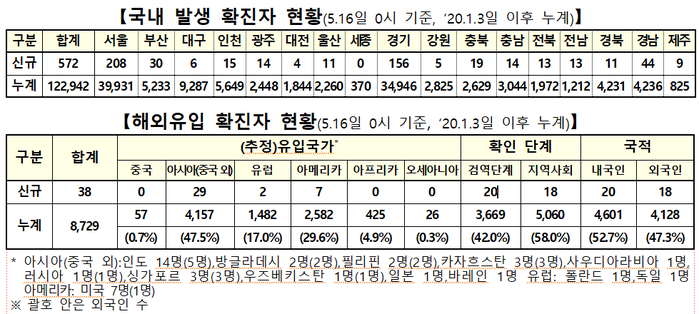 ▲ 16일 0시 기준 코로나19 국내발생 및 해외유입 확진자 현황. [출처=중앙방역대책본부] |