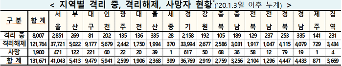 ▲ 16일 0시 기준 코로나19 지역별 격리 및 사망자 현황. [출처=중앙방역대책본부] |