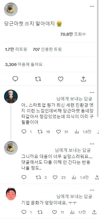 해당 트위터 게시물에는 “당근마켓 쓰지 말아야지”, “당근마켓은 동네 장터 같아 정감 있었는데 의식이 이렇게 구릴 줄이야”, “대응이 너무 실망스럽다”, “기업 문화가 엉망이다” 등의 반응이 잇따랐다.