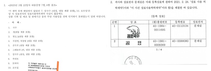 | ▲ 영동식품과 대한제분의 협업 계약서와 분쟁 상표들. |
