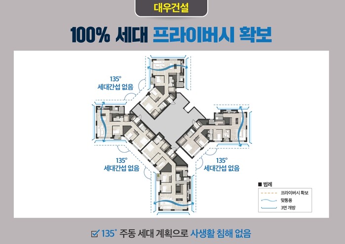 세대 환기를 뜻하는 통풍에서도 대우건설의 ‘3세대 판상형 타워’ 설계는 강점을 보여, 전세대에서 거실을 중심으로 한 맞통풍이 가능하도록 했다. 세대 단위에서의 통풍은 주거의 쾌적성을 가늠하는 매우 중요한 포인트로 과거 일자형 판상형 평면에서는 당연시 되어오던 전세대 맞통풍 설계는 타워형 설계가 도입되면서 일부 맞통풍이 불가능한 세대가 배치되는 단점이 생겼다. 대우건설은 타워형 배치의 개념을 코어에 반영하고 세대를 코어와 이격시킨 3세대 판상형 타워 설계를 적용함으로써 모든 세대에 맞통풍을 실현한 것이다.