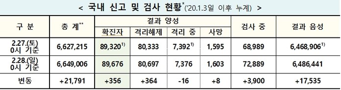 ▲ 28일 0시 기준 코로나19 국내 신고 및 검사 현황. [출처= 중앙방역대책본부] |