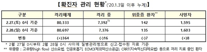 ▲ 28일 0시 기준 코로나19 확진자 관리 현황. [출처= 중앙방역대책본부] |
