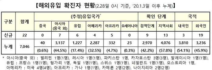해외유입 확진자 22명 가운데 9명은 입국 검역단계에서 확인됐고 13명(서울·경기·충남 각 3명, 부산·대구·강원·경북 각 1명)은 지역사회에서 자가격리 중 확진됐다. 국적별로는 내국인 3명, 외국인 19명이다.