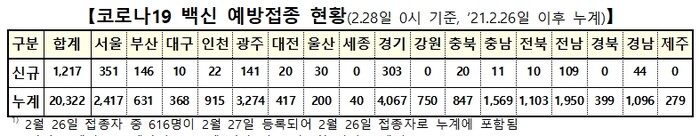 코로나19 예방접종 대응 추진단은 28일 0시 기준으로 전날 대비 1217명이 추가 접종받아 이틀간 총 2만322명의 접종이 완료됐다고 밝혔다. 아스트라제네카 백신 2만22명, 화이자 백신 300명이다.
