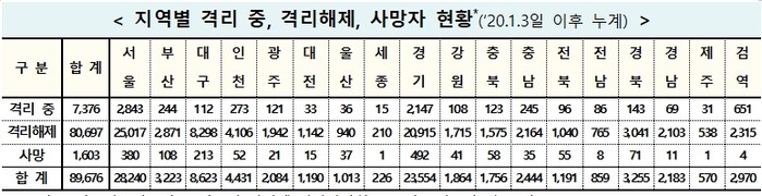▲ 28일 0시 기준 코로나19 지역별 격리 및 사망자 현황. [출처= 중앙방역대책본부] |