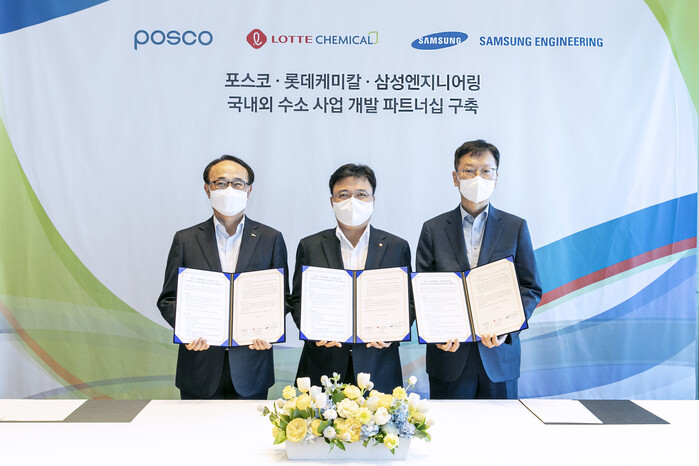삼성엔지니어링과 롯데케미칼, 포스코는 28일 '국내외 수소 사업 개발을 위한 파트너십 구축'에 대한 양해각서를 체결했다고 밝혔다.