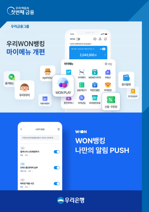 [메가경제=송현섭 기자] 우리은행은 ‘우리WON뱅킹’ 메뉴 개선을 통해 사용자 친화적으로 개인 맞춤형 서비스를 강화한다고 12일 밝혔다.
