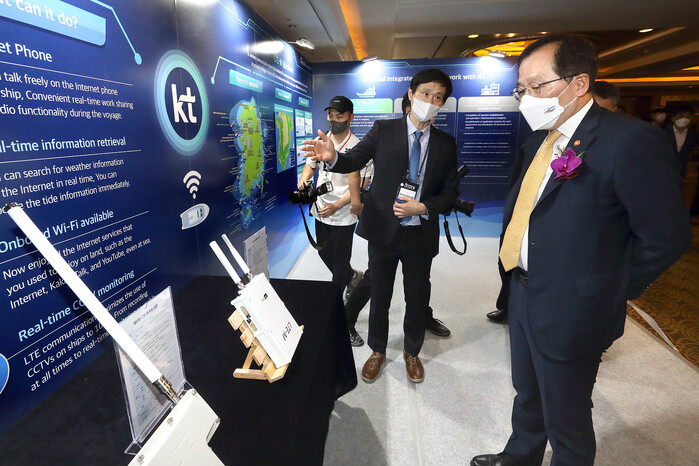 | ▲ 조승환 해양수산부 장관이 ‘제6회 아시아태평양지역 국제해양디지털 콘퍼런스’에 마련된 KT의 부스에 방문해 KT 관계자에게 지능형 해상교통정보 서비스 및 해상재난안전통신 제공용 LTE-M 구축 및 운영 현황, 송수신기 등 장비 등에 대한 설명을 듣고 있는 모습 [사진=KT 제공] |