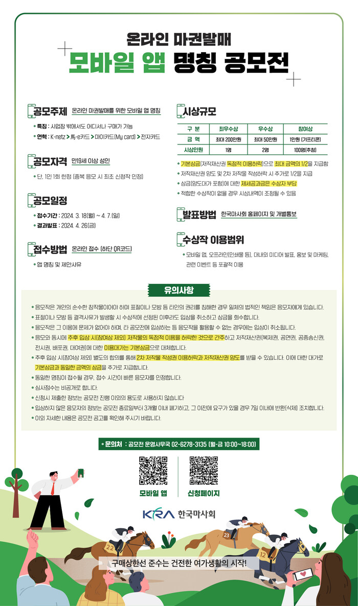 [메가경제=주영래 기자] 한국마사회(회장 정기환)가 오는 3월 18일부터 4월 7일까지 ‘온라인 마권발매 모바일 앱 명칭 공모전’을 개최한다.