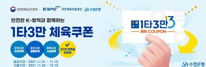 프로모션 쿠폰은 11월 19일까지 국민체육진흥공단 1타3만 홈페이지를 통해 한도소진 시까지 선착순으로 받을 수 있으며, 이용 가능시설은 홈페이지 내 ‘환급대상업체 찾기’ 메뉴에서 확인할 수 있다.