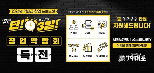 특히 이번 박람회에 참가하는 79대포는 통상적인 입지여건만 노리는 번화가 상권이 아닌 틈새시장을 겨냥한 동네상권에서 권리금 및 보증금 등 창업 리스크를 줄일 수 있다.