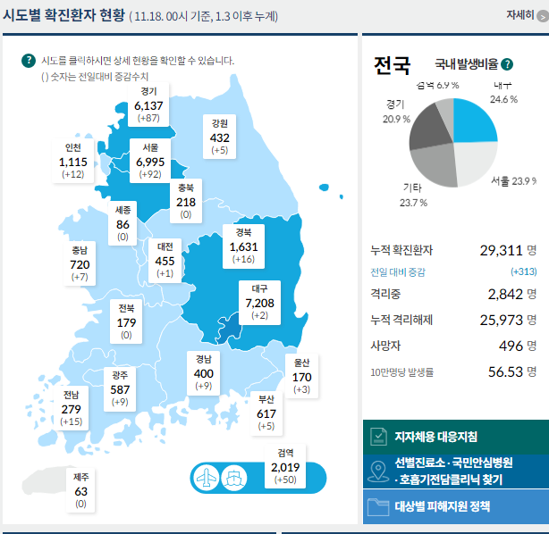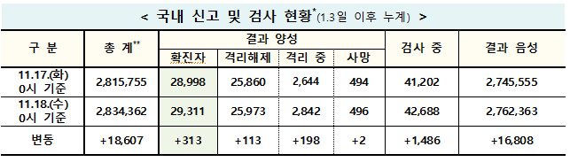 중앙방역대책본부(방대본)은 18일 0시 기준으로 전날 대비 코로나19 신규 확진자가 313명이 추가돼 지금까지 누적 확진자는 2만9311명으로 늘었다고 밝혔다.
