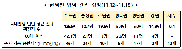 ▲ 최근 1주간 권역별 방역 관리 현황. [출처= 중앙재난안전대책본부] |
