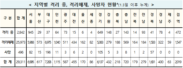 ▲ 18일 0시 기준 코로나19 격리 및 사망자 현황. [출처= 중앙방역대책본부] |