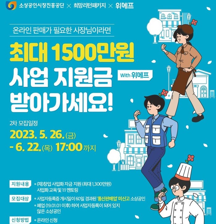 [메가경제=김형규 기자] 위메프가 소상공인시장진흥공단과 함께 폐업(예정) 소상공인 대상 재창업 지원 프로그램인 '희망리턴패키지' 사업을 진행한다고 14일 밝혔다.