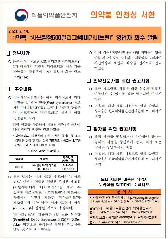 식약처는 '사브릴정 500㎎'이 영아에 주로 사용되는 점을 고려해 사전 예방 차원에서 영업자 회수를 권고했으며 의사와 약사, 소비자에게 의약품 안전성 서한을 배포했다고 말했다.