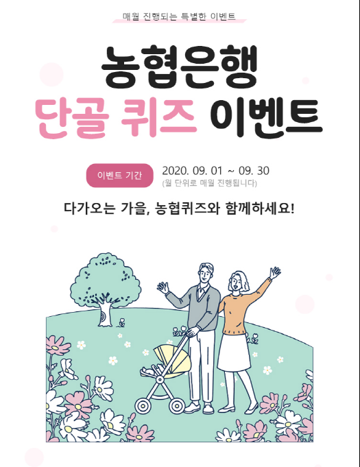 [메가경제= 최낙형 기자] NH농협은행은 농협은행의 모바일 플랫폼인 NH스마트뱅킹과 올원뱅크에서 1일부터 30일까지 한 달간 ‘9월 농협은행 단골퀴즈 이벤트’를 실시한다고 1일 밝혔다.