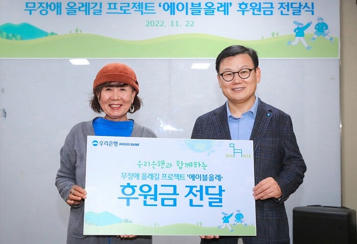 우선 지난 22일 사단법인 제주올레와 '우리은행과 함께하는‘에이블 올레 프로젝트’를 진행하고 기부금 2000만원을 전달했다. 이 프로젝트는 제주올레길이‘치유의 길’이라는 별칭을 얻으며 호평을 얻고 있는 만큼 누구나 즐길 수 있도록 장애 없는 길을 만들겠다는 목표로 시각장애인을 위해 마련됐다. 기부금은 ▲‘시각장애인과 함께 걷기 동행’자원봉사자 양성과정 ▲시각장애인 맞춤형 걷기 여행 프로그램 개발 및 운영 ▲시각장애인 올레길 이용 가이드 마련 등에 사용될 예정이다.