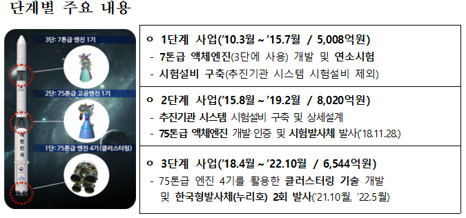 1차 발사를 실시해 국내에 발사체 핵심 기술력이 확보됐음을 확인은 했지만 아쉬움이 남았다. '위성모사체(더미 위성)'를 700㎞까지 올리긴 했지만 정확한 궤도에 안착시키는데는 실패했기 때문이다. 3단 엔진의 연소가 조기에 종료돼 위성모사체가 목표궤도에 안착하지 못했다.