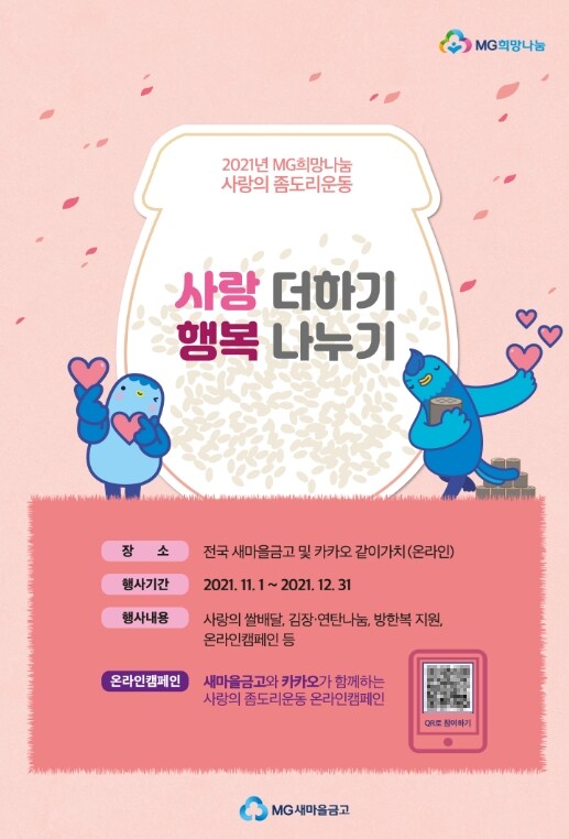 전국 1297개 새마을금고는 금년 11월 1일부터 연말까지 2021년 MG희망나눔 사랑의 좀도리운동을 전개한다고 밝혔다.