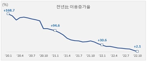 회복세의 영화관과 달리 OTT의 경우 성장세가 지속적으로 둔화되고 있다. 2020년 1월 전년 대비 이용회원 증가율은 168.7%에 달했으나 2021년 1월에는 94.6%, 2022년 1월은 30.6%까지 하락했고 2022년 10월에는 2.1% 수준까지 감소했다.