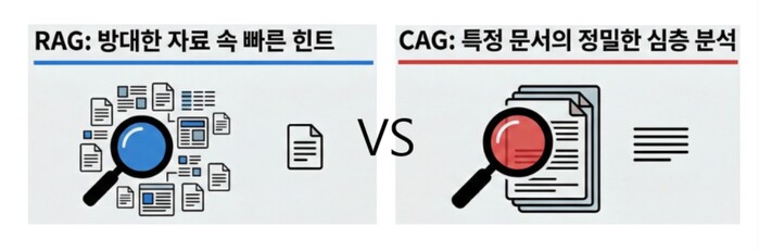 | ▲ 검색증강생성(RAG) : 질문과 관련된 자료를 저장소에서 참고하여 AI가 답변을 생성하는 기술과 문맥증강생성(CAG) : 특정 자료를 대화의 배경지식으로 학습해 두고 답변하는 기술 |