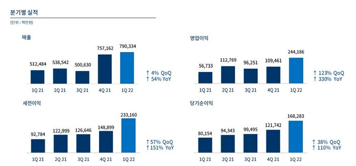 영업이익도 2442억 원으로 전년 동기보다 330% 성장했다. 당기순이익은 1683억 원으로 110% 늘었다.