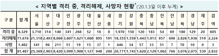 ▲ 9일 0시 기준 전날 대비 코로나19 지역별 격리 및 사망자 현황. [출처= 중앙방역대책본부] |