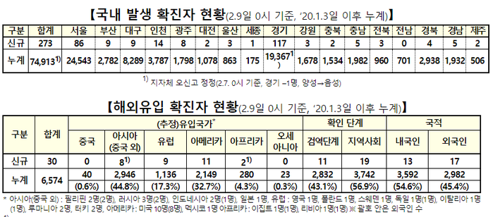 ▲ 9일 0시 기준 전날 대비 코로나19 국내발생 및 해외유입 확진자 현황. [출처= 중앙방역대책본부] |