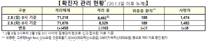 ▲ 9일 0시 기준 전날 대비 코로나19 확진자 관리 현황. [출처= 중앙방역대책본부] |