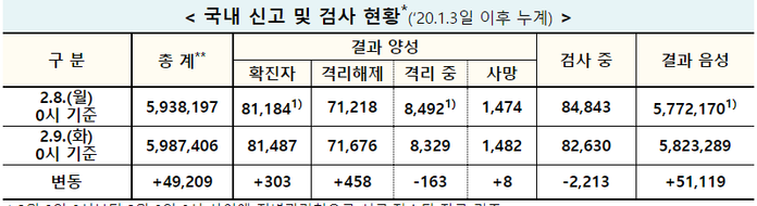 ▲ 9일 0시 기준 전날 대비 코로나19 국내 신고 및 검사 현황. [출처= 중앙방역대책본부] |