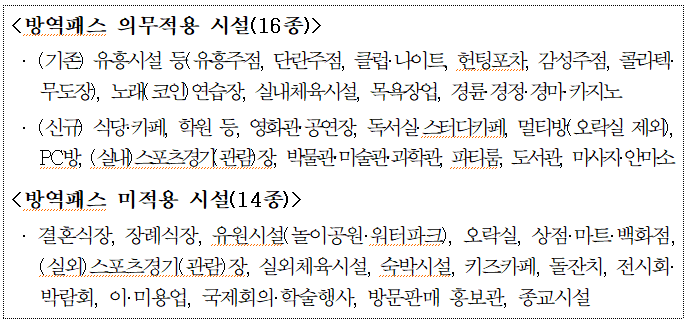 의무적용 미적용 시설은 결혼식장, 장례식장, 놀이공원, 상점·마트·백화점, 실외 스포츠경기관람장, 실외체육시설, 숙박시설, 키즈카페, 돌잔치, 전시회·박람회, 국제회의·학술행사, 방문판매 홍보관, 종교시설 등 14종이다.