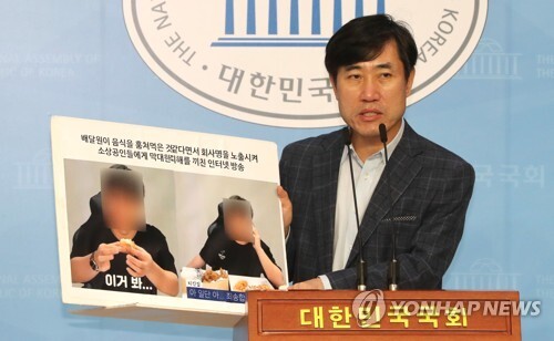 ▲ 하태경 의원이 지난해 서울 여의도 국회 소통관에서 아프리카TV 방송 도중 배달원이 음식을 훔쳐먹은 것 같다며 회사명을 노출시키는 등 관련 영상을 조작해 물의를 일으켰던 BJ에 대한 아프리카TV의 재심의를 촉구하는 기자회견을 하고 있다. [서울=연합뉴스] |
