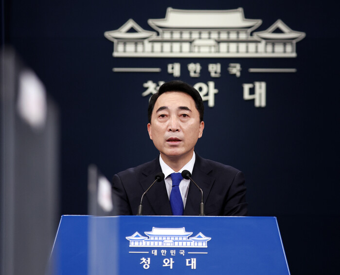 ▲ 박수현 청와대 국민소통수석이 10일 오전 춘추관에서 "문재인 대통령이 국민의힘 윤석열 대선후보가 현 정부를 근거 없이 적폐 수사의 대상, 불법으로 몬 것에 대해 강력한 분노를 표하며 사과를 요구한다"고 밝히고 있다. [사진=연합뉴스] |