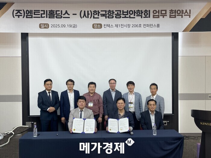 한국항공보안학회와 (주)엠트리홀딩스는 지난 19일 오후 2025년도 제2차 항공보안포럼에 앞서 킨텍스 제1전시장 컨퍼런스룸에서 박수진 (인하공업전문대학 교수)학회 윤리위원 진행 속에 업무협약을 체결했다.