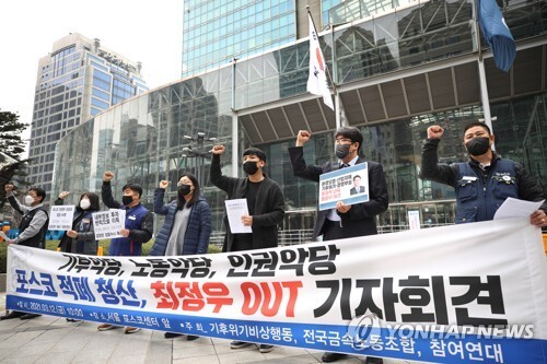 이날 시민·사회단체는 주총이 열린 포스코센터 앞에서 '포스코 적폐청산, 최정우 OUT 기자회견'을 진행하고 최 회장 연임 반대 시위를 벌였다.