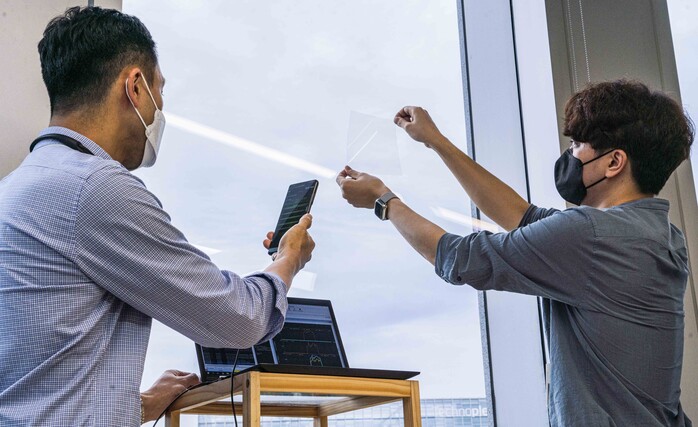 | ▲ SK텔레콤 판교사옥에서 연구원들이 5G 데이터 모뎀용 투명안테나 및 고주파 대역용 RIS 성능을 검증하는 모습. [사진=SK텔레콤 제공] |