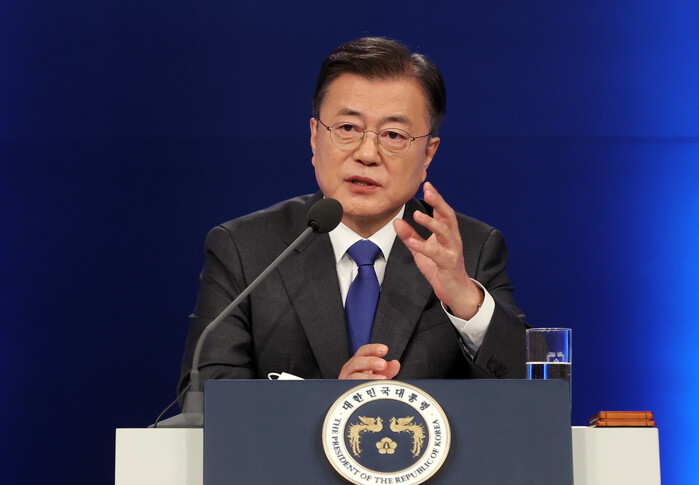 ▲ 문재인 대통령이 10일 청와대 춘추관 대브리핑룸에서 취임 4주년 특별연설을 마치고 기자의 질문에 답하고 있다. [사진= 연합뉴스] |