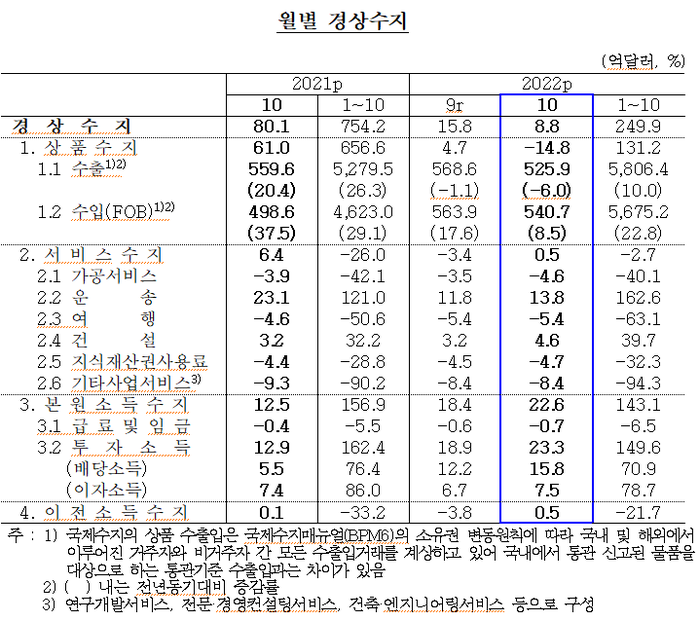 누적 경상수지 흑자폭 역시 지난해 동기 대비 대폭 감소했다. 지난해 1~10월 누적 경상수지는 504억3천만달러였으나 올해는 같은 기간 249억9천만달러로 절반 넘게 감소했다.