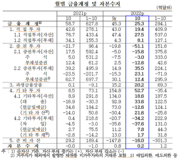 국제수지 가운데 본원소득수지 흑자(22억6천만달러)는 지난해 10월(12억5천만달러)보다 10억달러 넘게 증가했다.