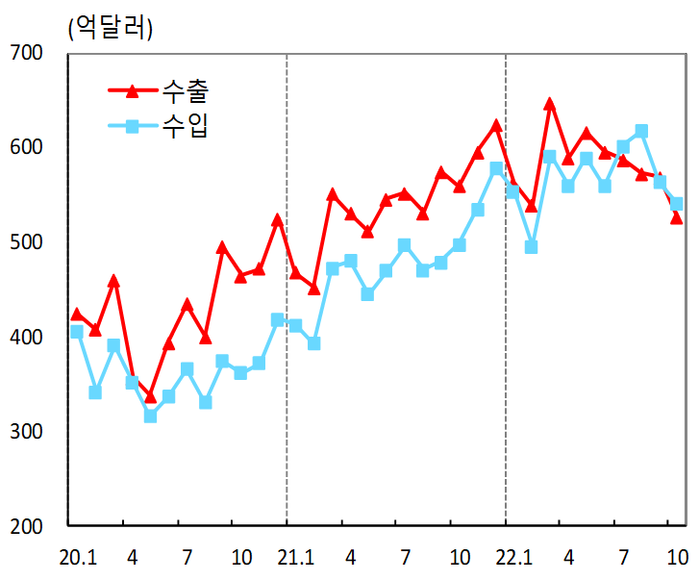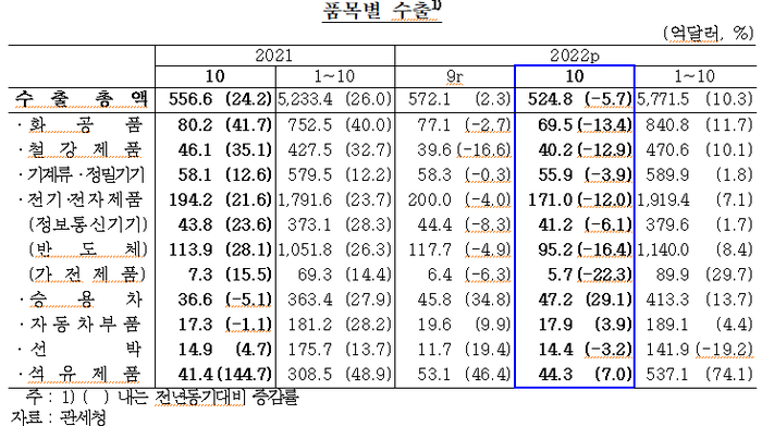 수출(525억9천만달러)은 1년 전보다 6%(33억6천만달러) 감소했다. 23개월 만에 처음 전년 동월 대비 감소(4억2천만달러)했던 9월 수출(570억9천만달러)에 이어 2개월 연속 역주행했다.