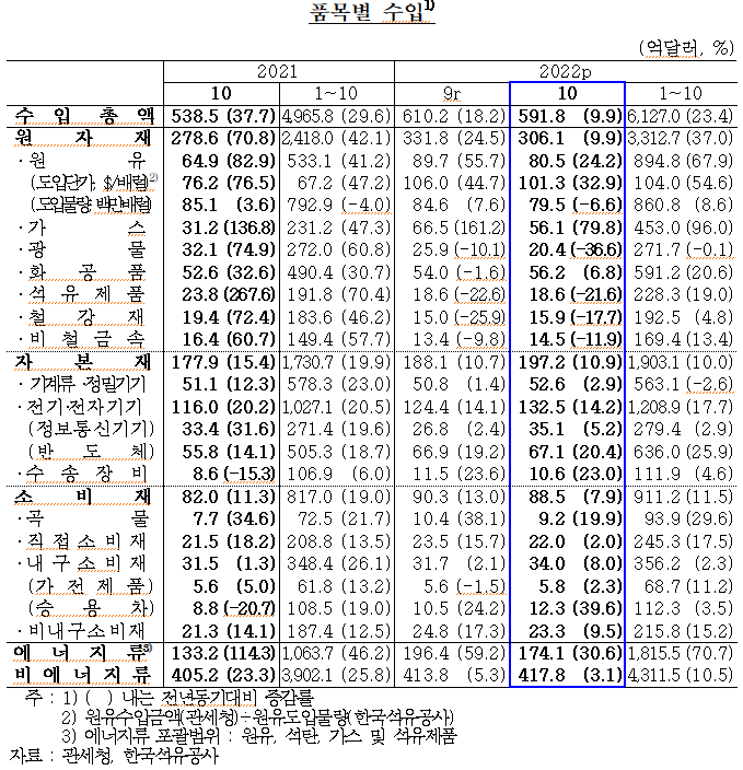 10월 통관기준 원자재 수입액은 306억1천만달러로 지난해 10월(278억6천만달러)보다 27억5천만달러가 많았다. 10월 전체 수입액의 52%를 차지한다.