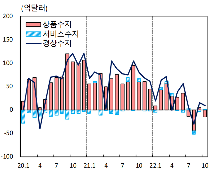 세부 항목별로 보면, 10월 상품수지는 14억8천만달러 적자를 보였다. 9월(4억9천만달러)에 소폭 흑자를 기록한지 한 달 만에 다시 적자로 돌아섰다. 지난해 10월(61억달러)과 비교하면 75억8천만달러나 크게 줄었다.