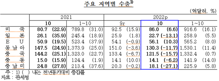지역별로는 미국(6.6%), 유럽연합(EU‧10.3%)으로의 수출이 증가한 반면 중국(-15.7%), 동남아(-11.7%), 일본(-13.1%)으로의 수출이 감소했다.