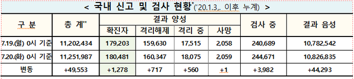 ▲ 20일 0시 기준 코로나19 국내 신고 및 검사 현황. [출처=중앙방역대책본부] |