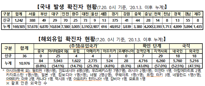 ▲ 20일 0시 기준 코로나19 국내발생(지역발생) 및 해외유입 확진자 현황. [출처=중앙방역대책본부] |