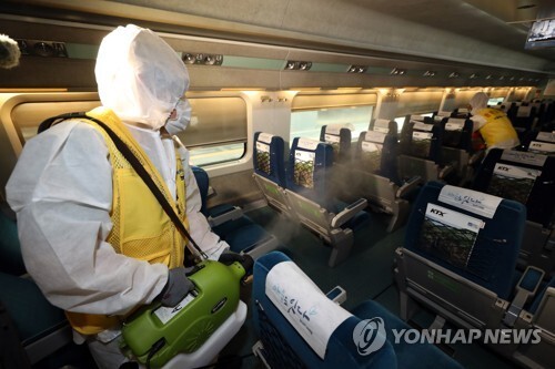 ▲ 20일 오전 서울역 승강장에 도착한 KTX 열차 안에서 작업자가 코로나19 예방 소독을 하고 있다. [사진=연합뉴스] |