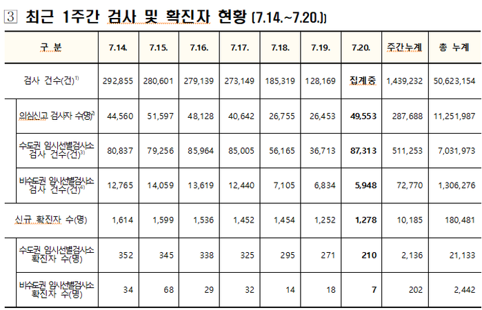 ▲ 최근 1주간 검사 및 확진자 현황. [출처=중앙방역대책본부] |